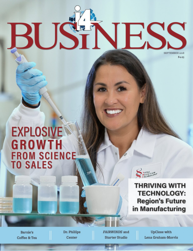 i4 Business magazine cover with a woman in a lab coat using lab instruments
